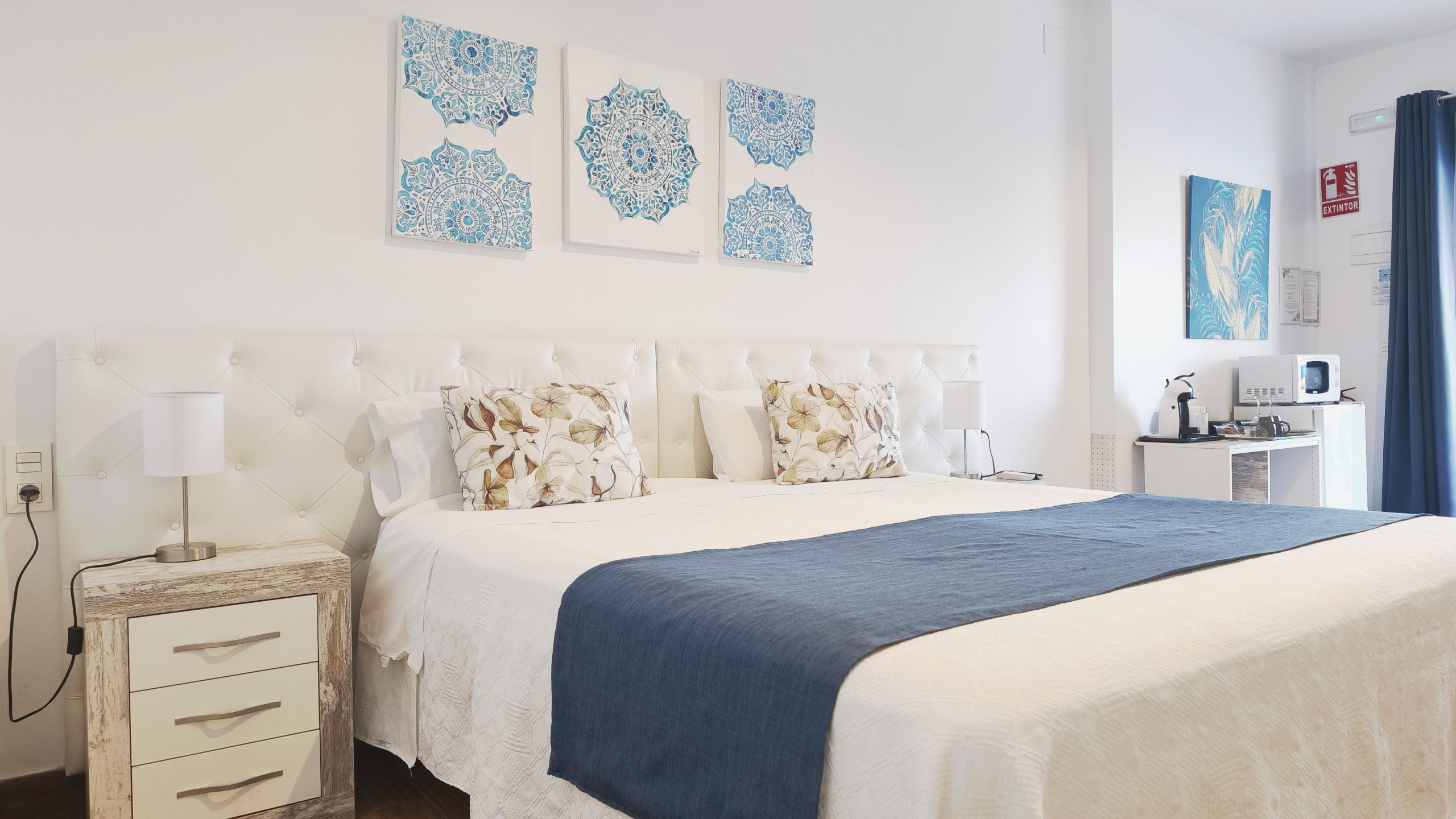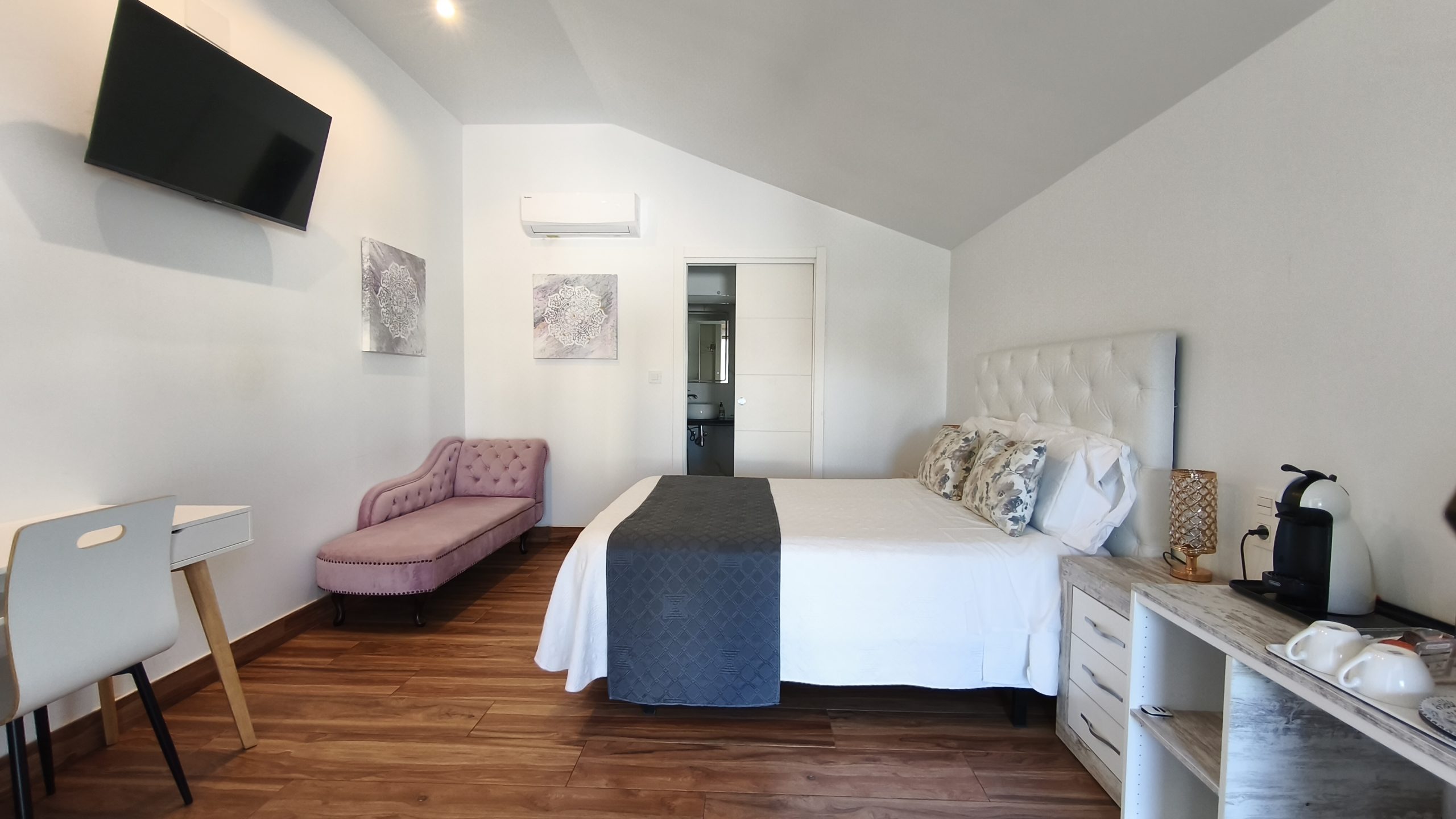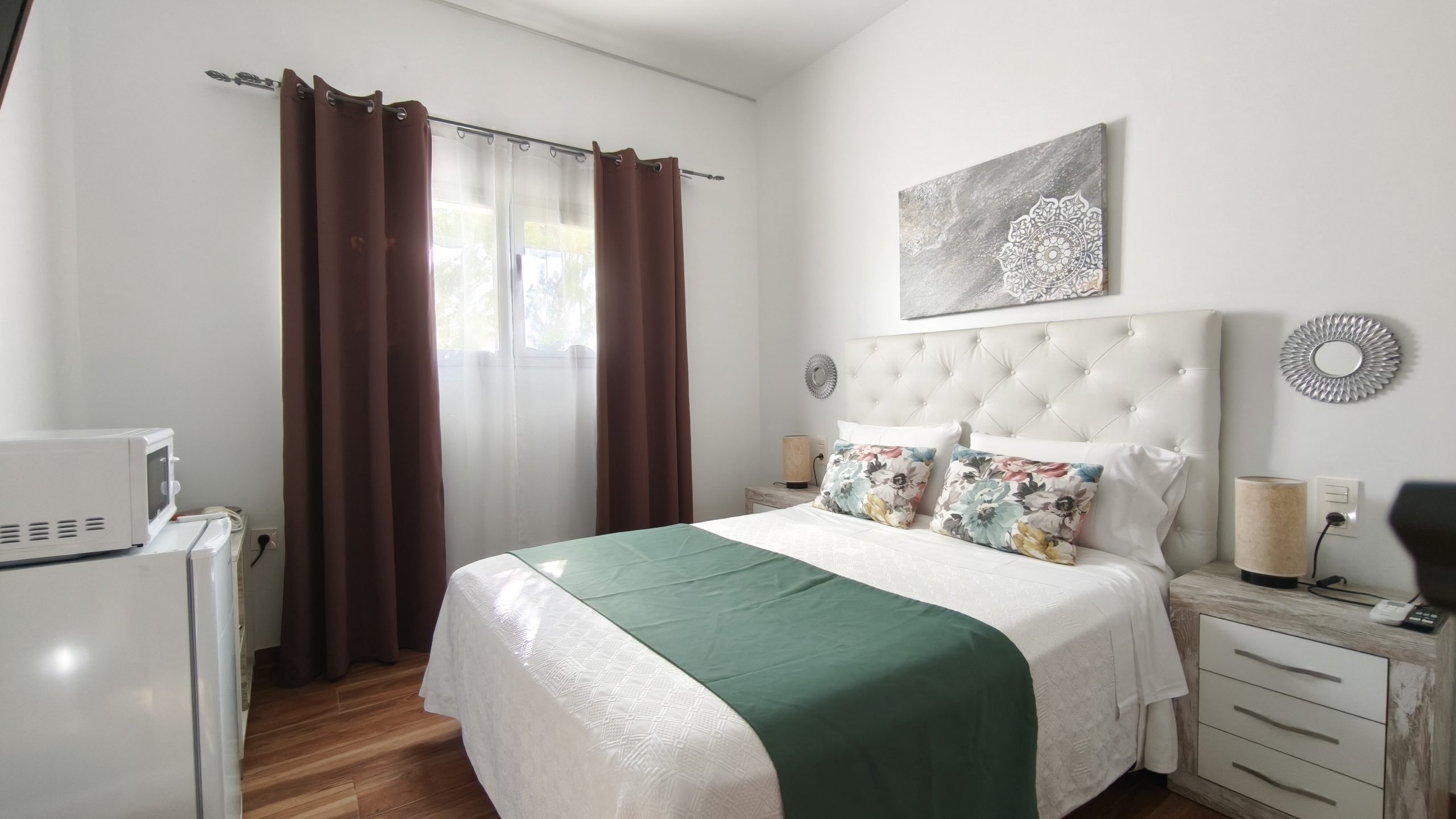There are four or five apartments, beautifully decorated, with a large television, coffee maker, fridge and complimentary breakfast. The beds are extremely comfortable with very good bedding.
